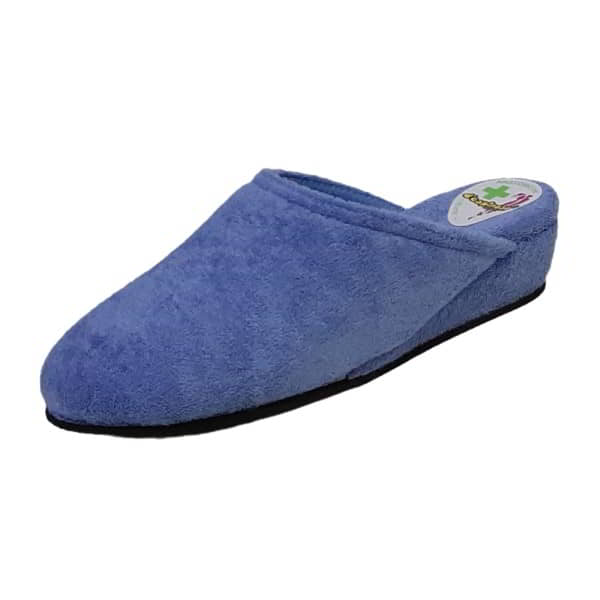 Zapatilla casa de mujer D’Espinosa Modelo 263 en toalla. Cerrada de puntera. Forro y la plantilla anatómica en toalla. Piso de goma micro y cuña de 3,5 cm.