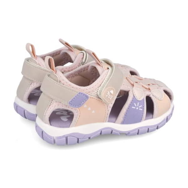 Garvalin Modelo Sandalia Cerrada – Sandalia para niñ@ combinada en tejido y material PU. Tiene el forro en tejido al tono. La plantilla esta acolchada. Con velcros en el empeine y tira trasera para su ajuste. Está adornada con un cordón en la pala. Combinada en diversos colores. El piso es de goma bicolor .