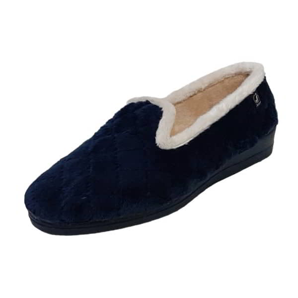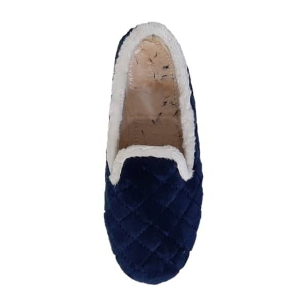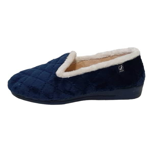 Javer Modelo 2348 – Zapatilla cerrada de casa para mujer en paño de peluche. Tiene forro y plantilla en paño beige. Está ribeteada en paño de peluche beige. Con lengüeta en el empeine. El paño está cosido haciendo rombos por toda la zapatilla. Tiene el piso de goma con cuña de 2 cm.