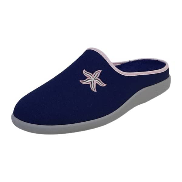 Zapatilla casa de mujer Javer Modelo 26-347 en tejido. Forro en tejido. Plantilla extraible acolchada y de tejido toalla. Con bordado de flor. Piso de goma.