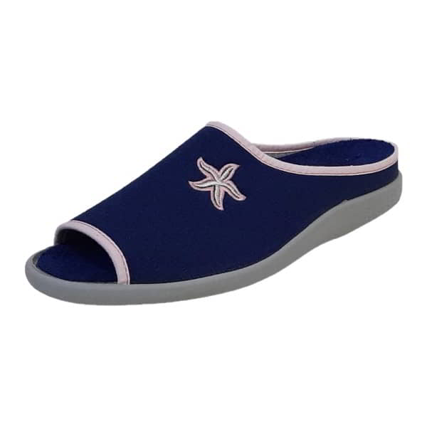 Zapatilla casa de mujer Javer Modelo 26-352 en tejido. Forro en tejido. Plantilla acolchada y de tejido toalla. Con bordado de flor. Piso de goma.