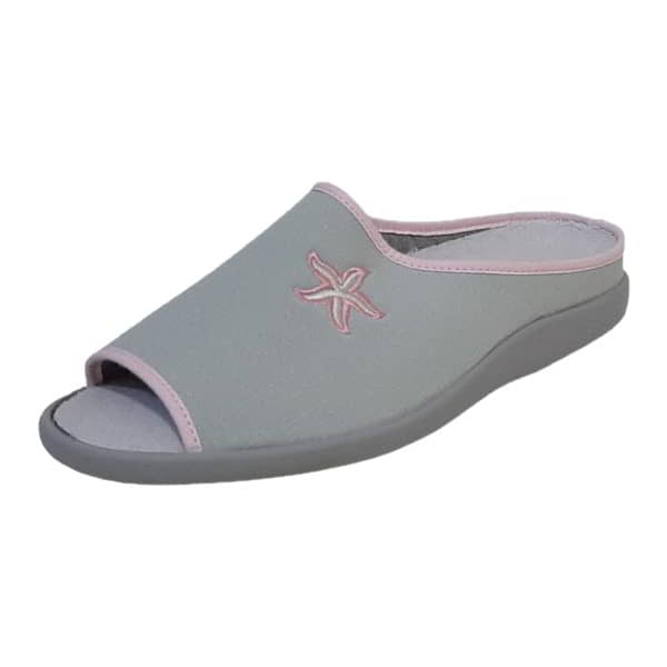 Javer Modelo 26-352Zapatilla de estar por casa para mujer en tejido liso. Tiene el forro en tejido gris. Está abierta en la puntera. La plantilla extraible está acolchada y es de tejido toalla al tono. Con bordado de flor en el empeine. Está ribeteada en tejido liso en color rosa. El piso es de goma ligera y flexible en color gris. Fabricado en España.