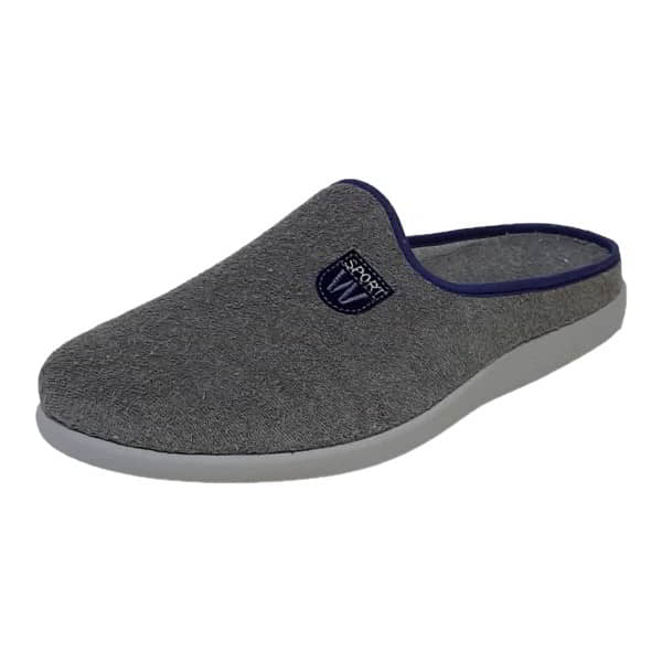 Javer Modelo 2756Zapatilla de estar por casa para hombre en tejido toalla. Tiene el forro en tejido gris. Está cerrada en la puntera. La plantilla extraible está acolchada y es de tejido toalla al tono. Con bordado en el empeine. Está ribeteada en tejido liso gris. El piso es de goma ligera y flexible en color gris. Fabricado en España.