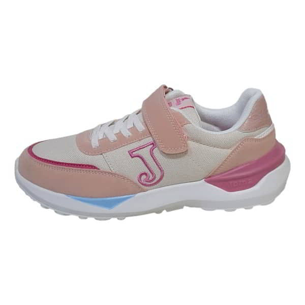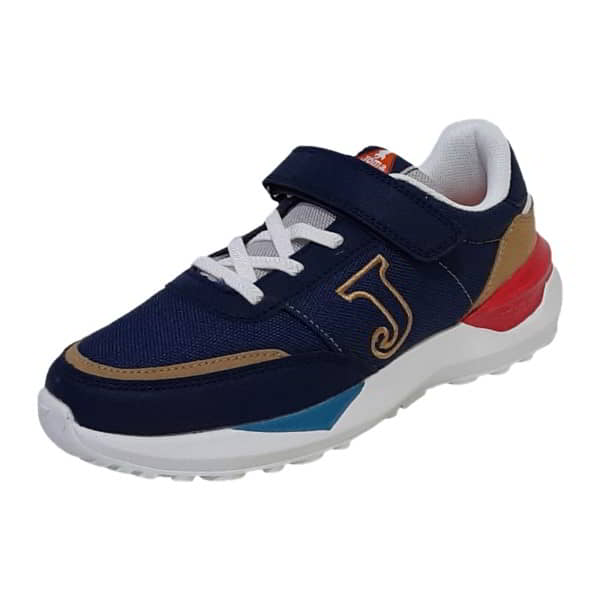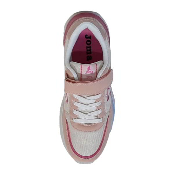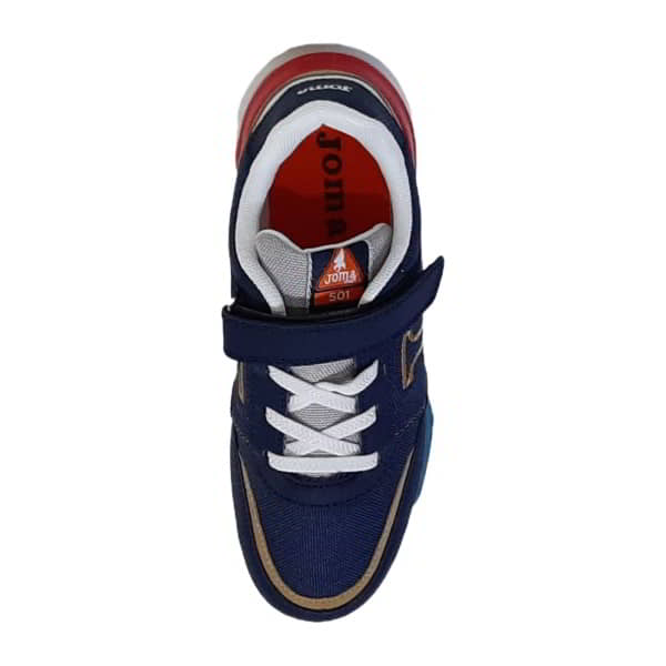 Deportiva de niñ@ Joma Modelo 501 Junior en tejido. Con velcro y cordón elástico. Forro y plantilla en tejido. Piso de goma blanco con adornos laterales.
