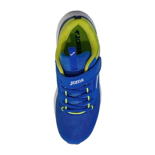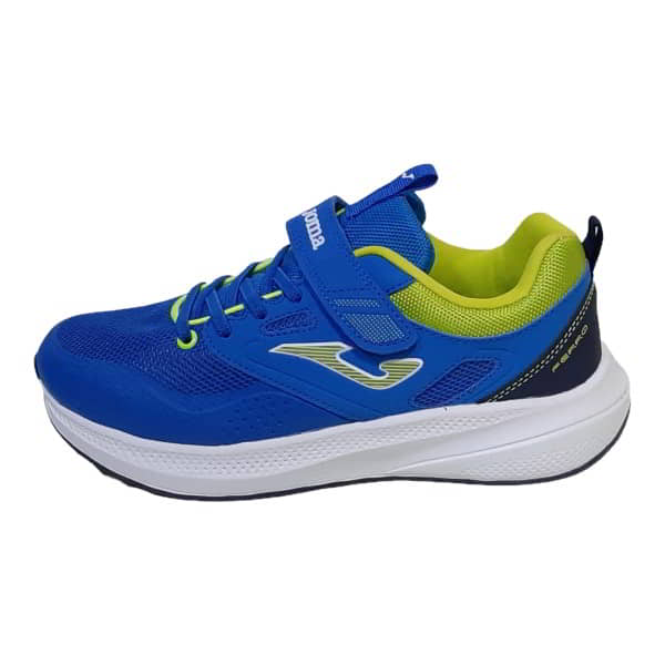 Joma Modelo Ferro Junior – Deportiva para niño en tejido rejilla, con adornos en micro PU. Con ajuste de velcro y cordón elástico al tono. Tiene la parte trasera acolchada. El forro y cuello en tejido color amarillo. La lengüeta en tejido al tono. La plantilla de tejido en color amarillo. El piso es de goma bicolor en tonos blanco y azul.