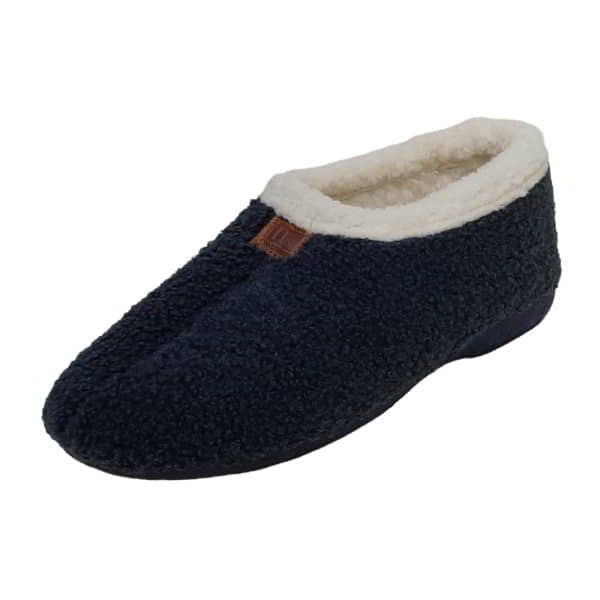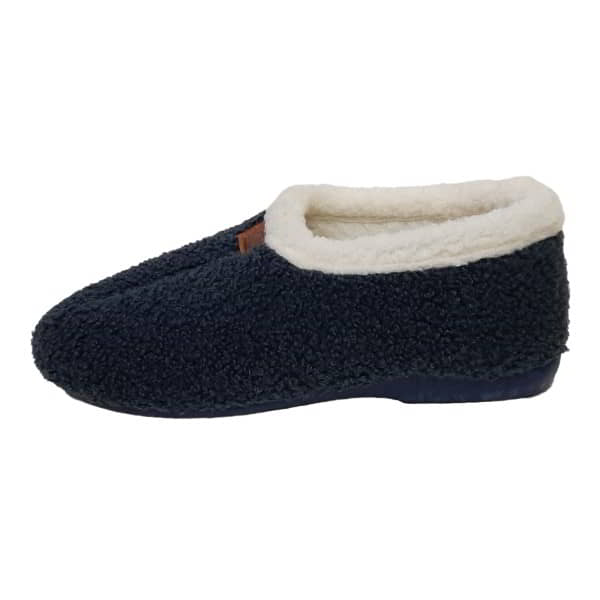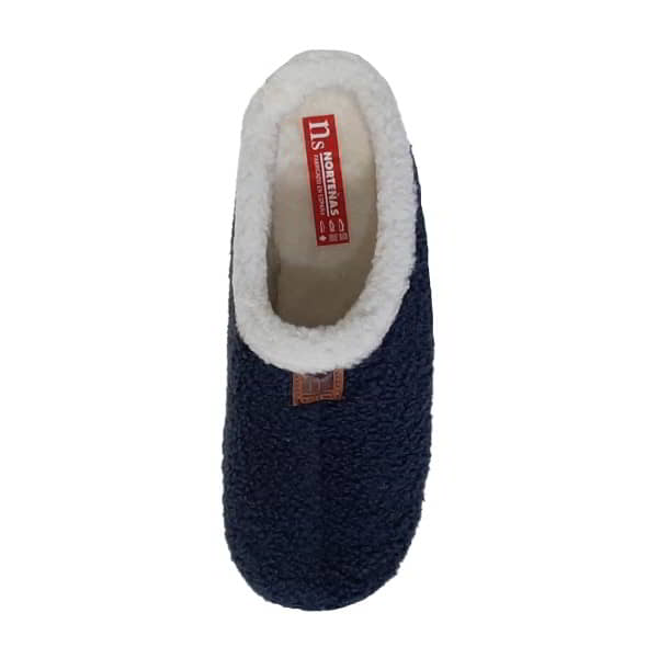 Norteñas Modelo 31-321 – Zapatilla cerrada de casa para mujer en paño rizado. Tiene el forro y plantilla borreguillo. Está ribeteada en borreguillo. Tiene adorno cosido del logo de la marca en el empeine. Con piso de goma en tono beige y cuña de 1,5 cm.