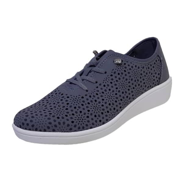 Pikarinas Modelo PK1 – Zapato blucher para mujer en material flexible. Tiene la plantilla extraible en tejido y está acolchada. Con cordones elásticos para su ajuste. El material tiene dibujo y perforaciones de adorno. La trasera y la parte de los cordones en material liso. Piso de goma micro ligero blanco con cuña de 2 cm.
