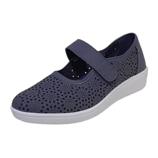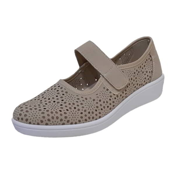 Pikarinas Modelo PK2 – Zapato mercedes para mujer en material flexible. Tiene la plantilla extraible en tejido y está acolchada. La tira en el empeine tiene velcro, para su ajuste. El material tiene dibujo y perforaciones de adorno. La trasera y la tira de ajuste en material liso. Piso de goma micro ligero blanco con cuña de 2 cm.
