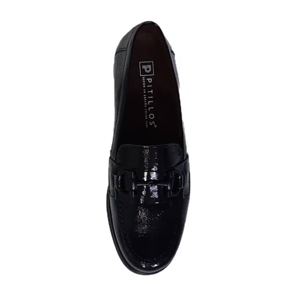Zapato de mujer Pitillos Modelo 10701 en charol. Forro y plantilla extraible en tejido. Con banda y cadena en el empeine. Piso de goma y cuña de 1,5 cm.
