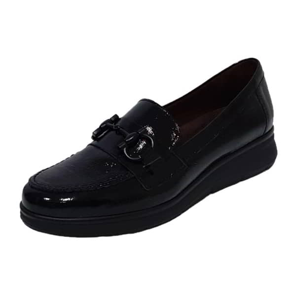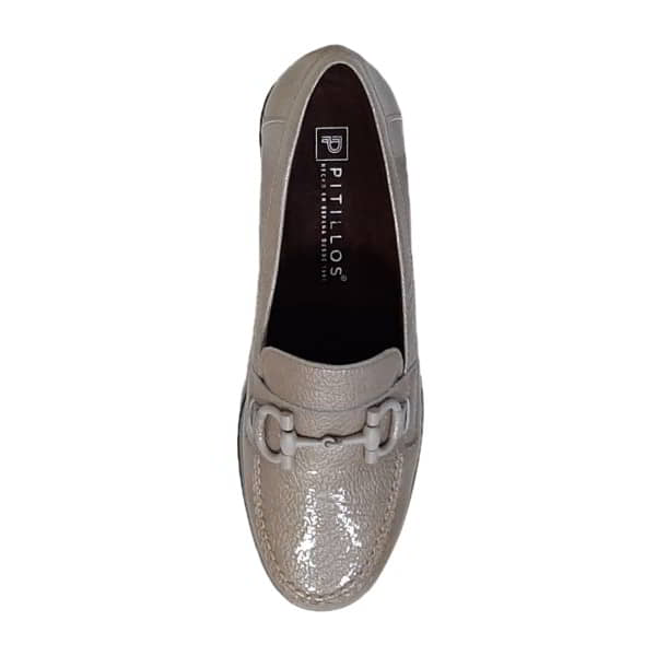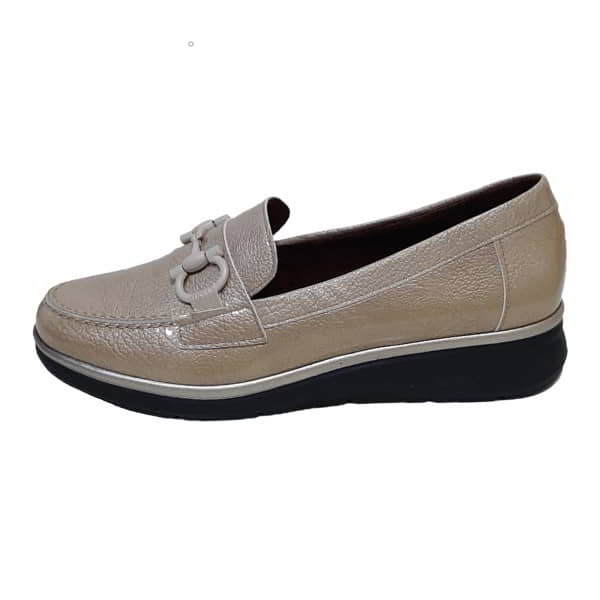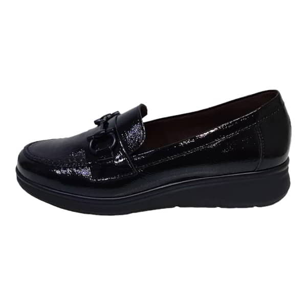 Pitillos Modelo 10701 – Zapato mocasín para mujer en charol piel grabado. Tiene el forro y plantilla extraible en tejido transpirable. Con banda y cadena en el empeine. El piso es de goma negro con vira al tono y con cuña de 1,5 cm.