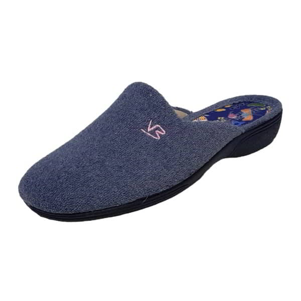 Zapatilla casa de mujer Vulca-Bicha Modelo 4718 en toalla. Forro en tejido. Plantilla en tejido estampado. Puntera cerrada. Piso de goma y cuña de 1,5 cm.